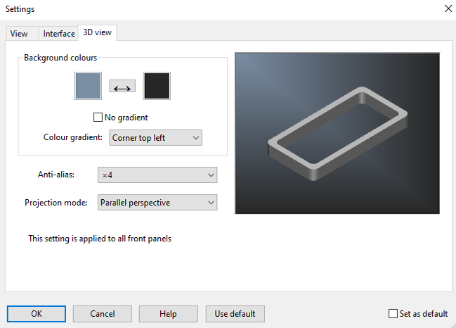 In the settings dialog’s 3D view tab (Ctrl + E), you specify the settings for the 3D view window.